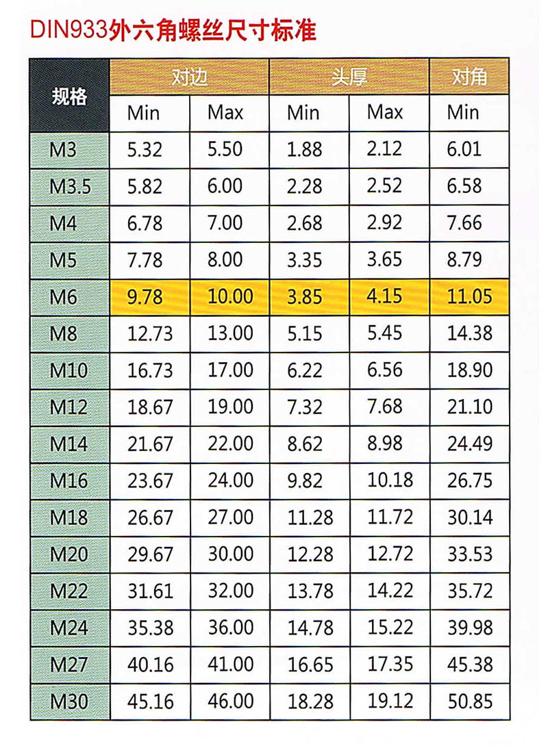 DIN933外六角螺丝尺寸标准